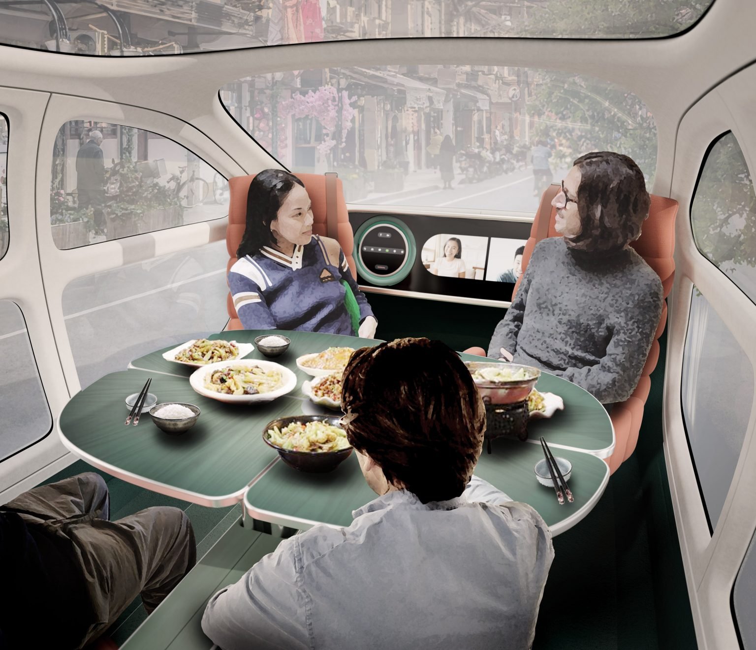 Masuk ke dalam interior, mobil ini memiliki desain fleksibel dengan kursi putar sehingga mampu menyesuaikan dengan peruntukkan ruang. Bila kursi berhadapan, sebuah meja lipat di tengah “kokpit” bisa dimunculkan sehingga mendukung aktivitas “dining”. Menonton film atau bermain game pun bisa dilakukan dengan menambahkan layar digital atau display.