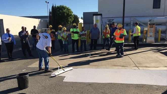 Untuk menangkal panas yang kian menyengat, salah satu kota yaitu Los Angeles di AS yang bisa mencapai suhu 38 derajat Celcius pada siang hari, para pekerja kontraktor menyiapkan siasat dengan mewarnai ulang aspal-aspal kota.