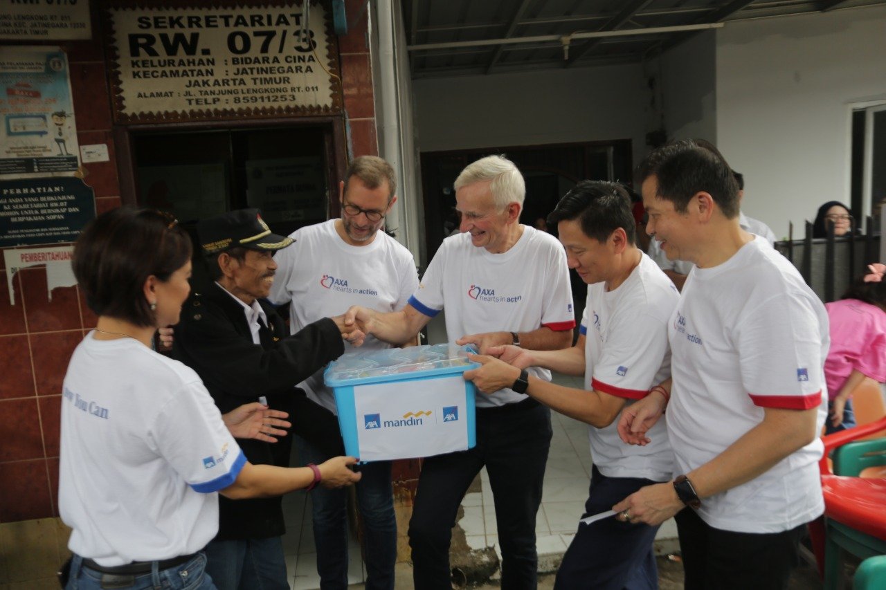 Komitmen AXA Group sebagai perusahaan suransi global adalah memberdayakan masyarakat Indonesia untuk kehidupan lebih baik. Bersamaan dengan kunjungan Chairman of Board Directors AXA Group Denis Duverne ke Indonesia, AXA mendistribusikan bantuannya untuk korban banjir di Jakarta. Denis bahkan menyempatkan diri untuk terjun langsung menyerahkan bantuan tersebut. Hal ini dilakukan di sela-sela kesibukannya melakukan pertemuan dengan Bank Mandiri dan pejabat senior pemerintah.
