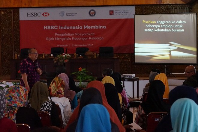 Sebagai bagian dari komitmen untuk mendukung perluasan literasi dan inklusi keuangan masyarakat, HSBC bekerja sama dengan Putera Sampoerna Foundation (PSF) dan Sampoerna University menyelenggarakan Lokakarya dan edukasi keuangan untuk istri nelayan di Taman Budaya Wakatobi, Sulawesi Selatan kamis (23/11). Sekitar 100 peserta diberikan edukasi dan pelatihan dasar mengenai cara mengelola keuangan keluarga.