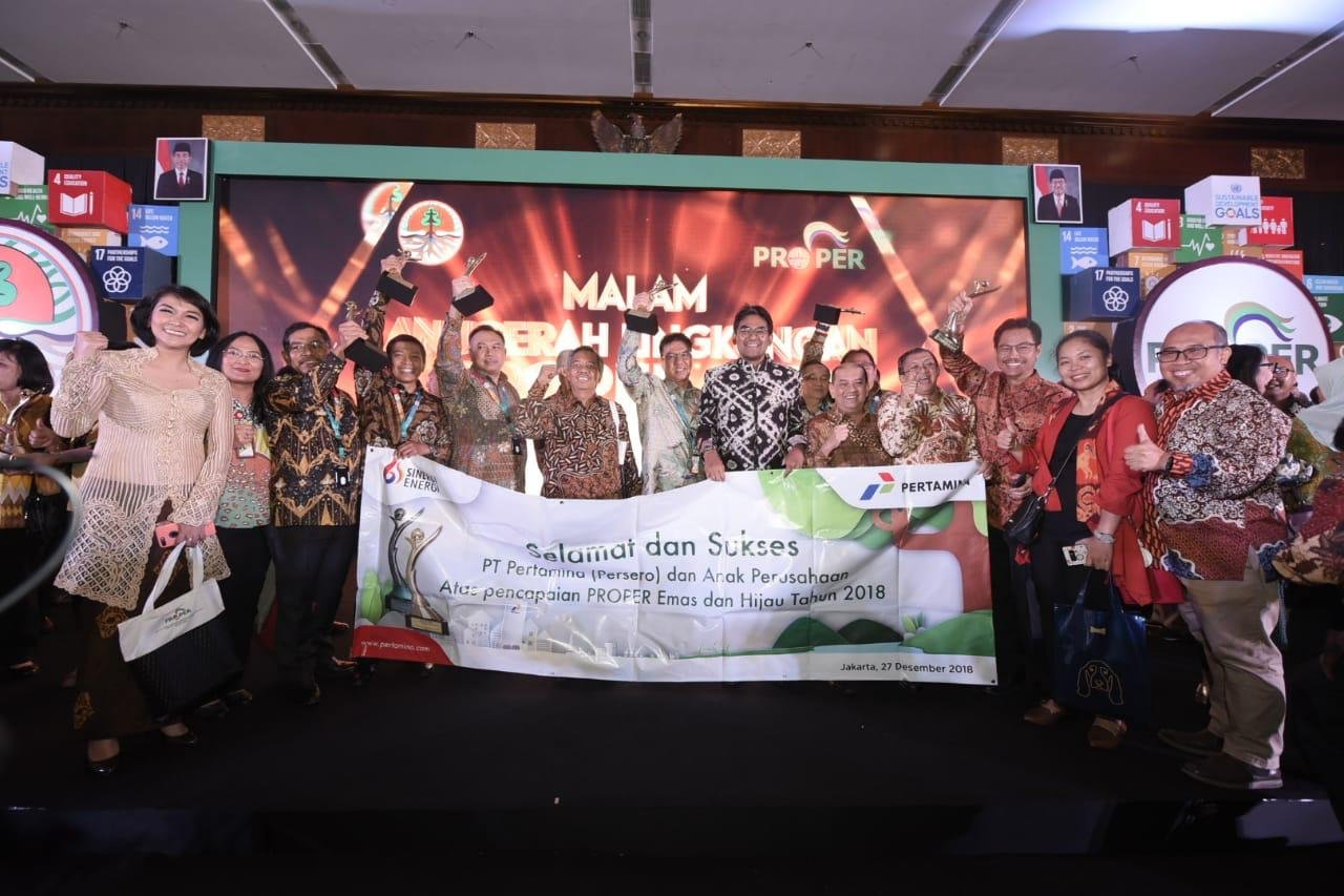 Pertamina berhasil raih 13 Proper Emas pada Malam Penganugerahan Program Penilaian Peringkat Kinerja Perusahaan (PROPER) periode 2017-2018. Penghargaan PROPER Emas diserahkan oleh Menteri Lingkungan Hidup dan Kehutanan Siti Nurbaya Bakar di Hotel Bidakara, Jakarta, Kamis 27 Desember 2018.