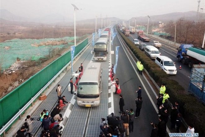 Jinan – Majalahcsr. China membuka jalan tol sepanjang satu kilometer yang mampu menghasilkan tenaga surya sepanjang untuk dilakukan uji coba. Panel surya diletakkan di bagian bawah jalan lingkar di sekitar Jinan, ibu kota Provinsi Shandong di China Timur. Permukaan jalan terbuat dari material yang transparan dan berbobot berat sehingga tembus sinar matahari.