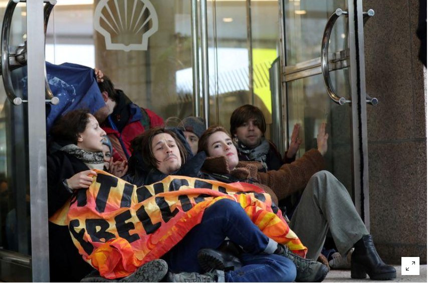 “Shell adalah salah satu pencemar lingkungan terbesar,”kata seorang wanita yang menempelkan tubuhnya di tangga luar gedung. “Jika kami punya kesempatan menghentikan perubahan iklim Shell adalah salah satu perusahaan pertama yang harus pergi.”