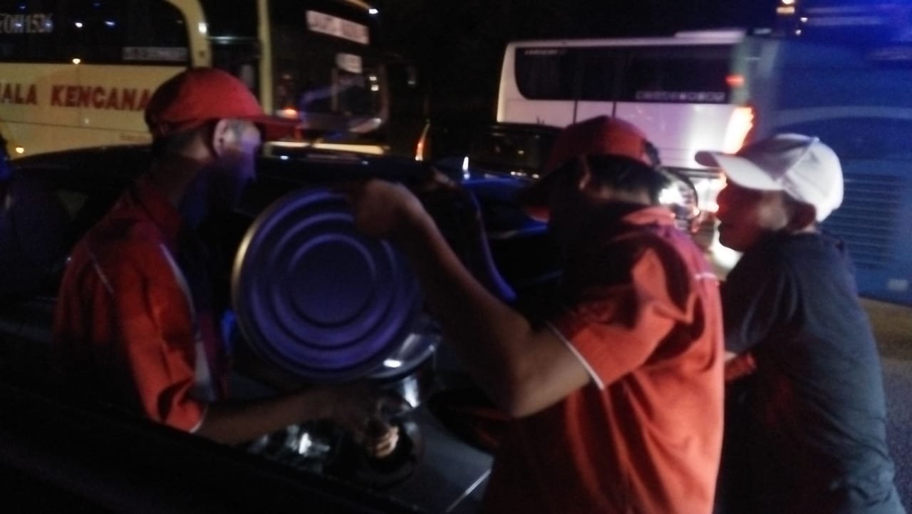 Bahu membahu mereka menyeberangkan Pertamax kemasan melakui barrier atau pembatas jalan. 5 buah mobil milik pemudik yang terjebak di jalur contra flow dalam kondisi BBM kritis pun akhirnya bisa melanjutkan perjalanan pulang.