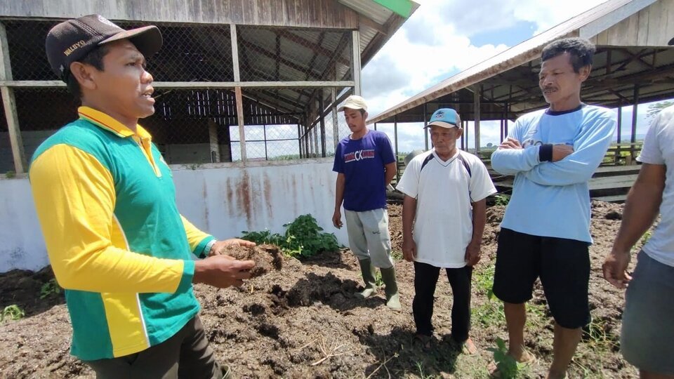 Waluyo (kiri), Ketua Gabungan Kelompok Tani (Gapoktan) Cipta Karya, tengah berdiskusi bersama anggota. Foto: Istimewa