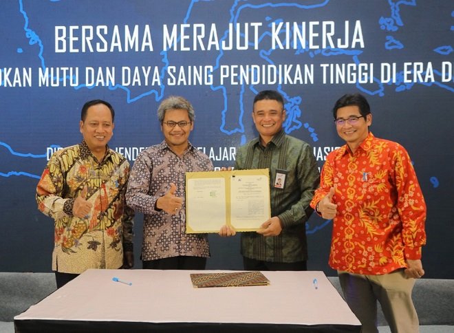 Direktur Enterprise and Business Service PT Telkom Indonesia (Persero) Tbk (Telkom) Dian Rachmawan (kedua dari kanan) dan Sekretaris Jenderal Kementerian Riset, Teknologi, dan Pendidikan Tinggi (Kemenristekdikti) Republik Indonesia Ainun Naim (kedua dari kiri) saat menandatangani Nota Kesepahaman tentang “Kerja Sama Penyediaan Fasilitas Telekomunikasi untuk Indonesian Research and Education Network (IdREN) disaksikan oleh Menteri Riset, Teknologi, dan Pendidikan Tinggi RI Mohamad Nasir (paling kiri) serta Direktur Jenderal Pembelajaran dan Kemahasiswaan Kemenristekdikti Intan Ahmad (paling kanan) di Jakarta (19/12). Dok. Telkom