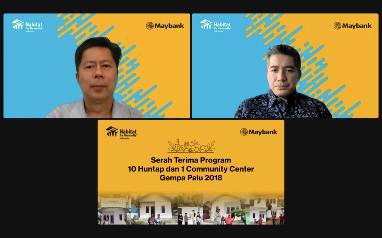 MajalahCSR.id – PT Bank Maybank Indonesia, Tbk. melalui program Maybank Berbagi dan Yayasan Habitat Kemanusiaan Indonesia, Kamis (27/1/2022), melakukan serah terima simbolis rumah tinggal dan balai pertemuan kepada para penyintas bencana gempa tiga tahun lalu di Sulawesi Tengah. Acara diselenggarakan secara virtual dan dihadiri oleh Presiden Direktur, Maybank Indonesia, Taswin Zakaria, Direktur Nasional, Habitat for Humanity, Susanto, serta penerima bantuan dan perwakilan Pemerintah Desa Jono Oge.