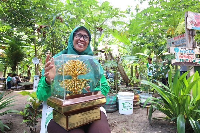 Mahariah bersama piala Kalpataru tingkat nasional. Sampai hari ini Ia merasa tidak pantas mendapatkan apresiasi tersebut karena masih sedikit hal yang telah dilakukan.Dok. Astra