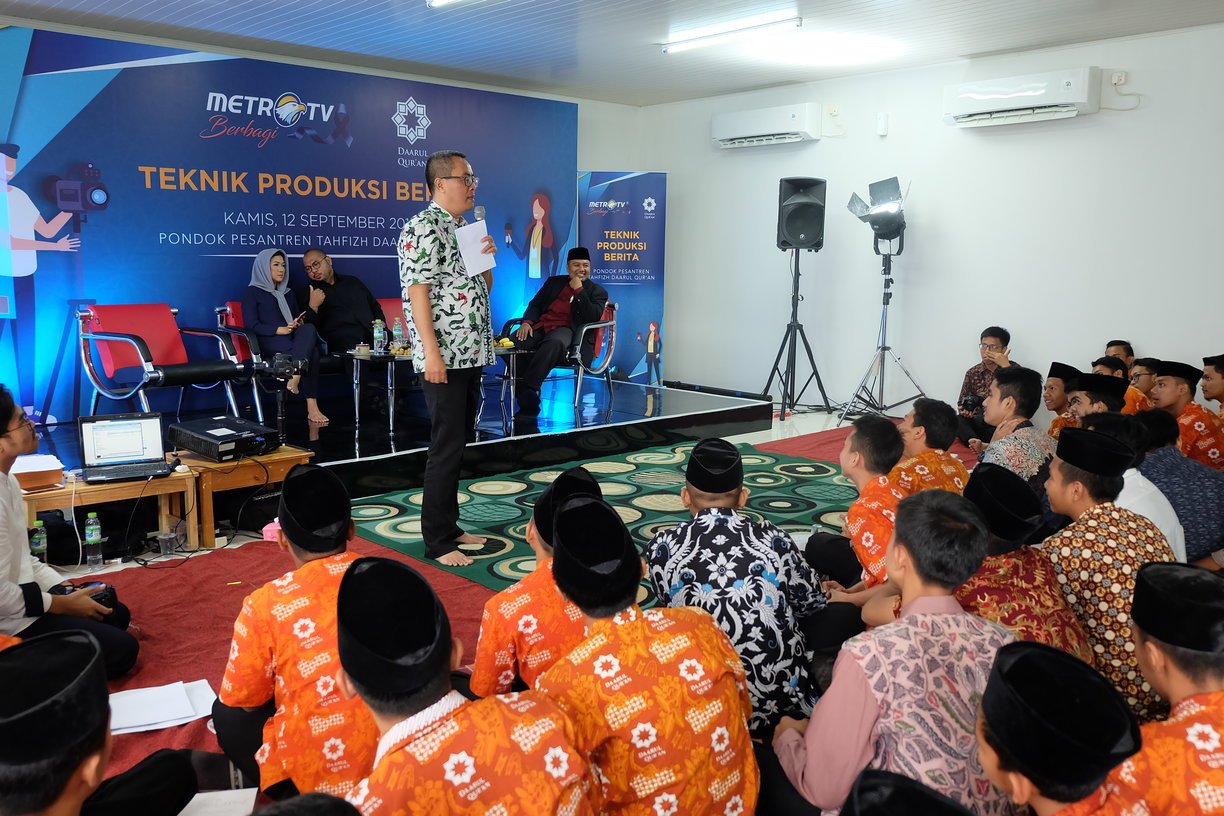 Metro TV kembali menyelenggarakan “Metro TV Berbagi” yang digelar di Pondok Pesantren Tahfizh Daarul Qur’an Cipondoh, Tangerang. Kegiatan ini sebagai wujud bakti Metro TV dalam bidang Pendidikan. Kegiatan ini diikuti oleh ratusan santri dan santriwati dengan tema “Teknik Penulisan Berita” yang disampaikan oleh narasumber andal yakni Andi Setia Gunawan – Jurnalis Senior Metro TV. Turut hadir M. Mirdal Akib – Finance and Technical Support Director Metro TV yang mengingatkan pentingnya peran anak bangsa terhadap kemajuan Indonesia.