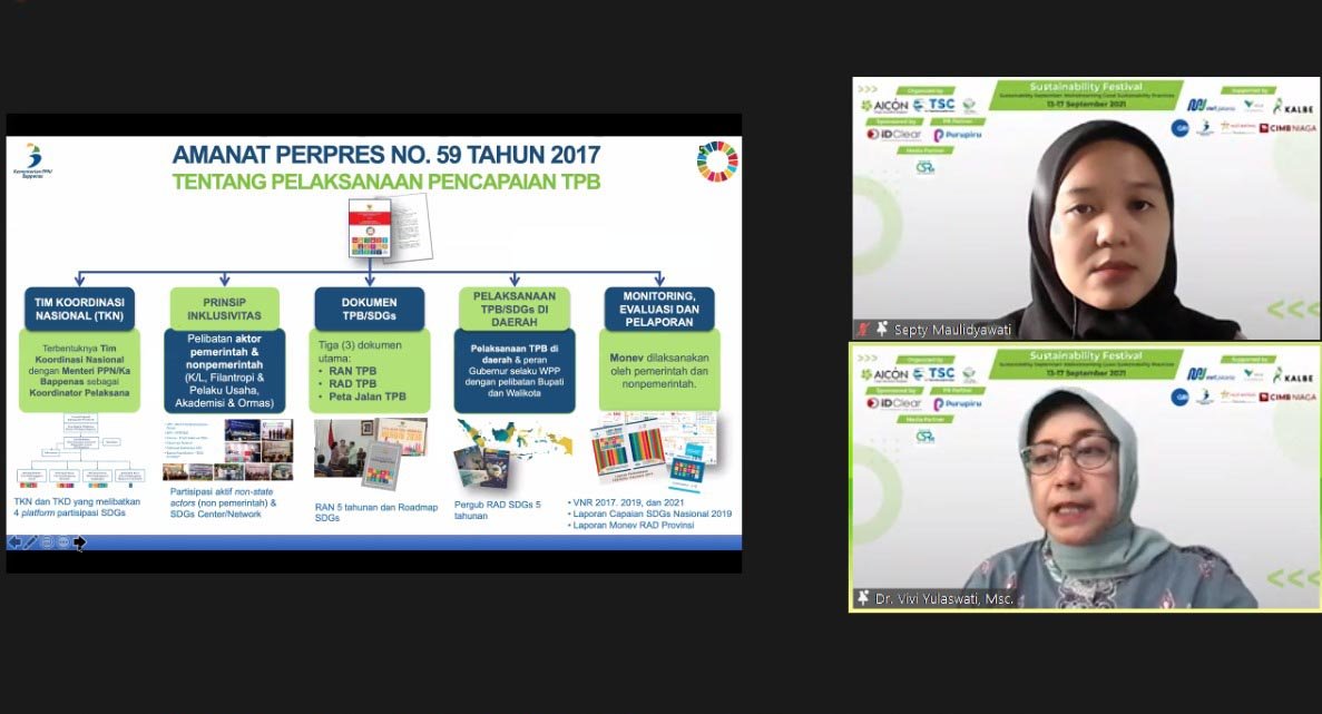 Berbagai instrumen dalam bentuk berbagai dokumen telah disusun mulai dari peta jalan, strategi di masing-masing goal, serta target, dan kebutuhan pendanaannya, juga rencana aksi TPB yang dilakukan pemerintah. Hal ini disampaikan terang Vivi Yulaswati, Kepala Sekretariat Nasional SDGs/Ahli Menteri Bidang Sosial dan Penanggulangan Kemiskinan Kementerian PPN/Bappenas dalam sambutan acara webinar ”Sustainability Festival 2021”, Senin (13/9/2021). “Saat ini rencana aksi untuk Tujuan Pembangunan Berkelanjutan untuk periode 2021- 2024 sedang kita revisi,” cetus Vivi.