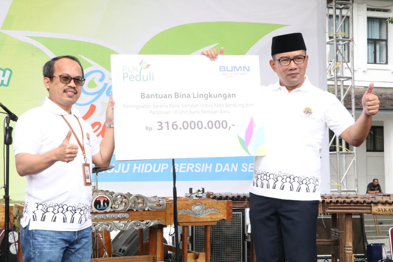 General Manager PLN Distribusi Jawa Barat Iwan Purwana secara simbolis menyerahkan bantuan dana sebesar Rp316 juta kepada Walikota Bandung Ridwan Kamil yang selanjutnya akan diteruskan kepada pengelola Bank Sampah Induk Kota Bandung.