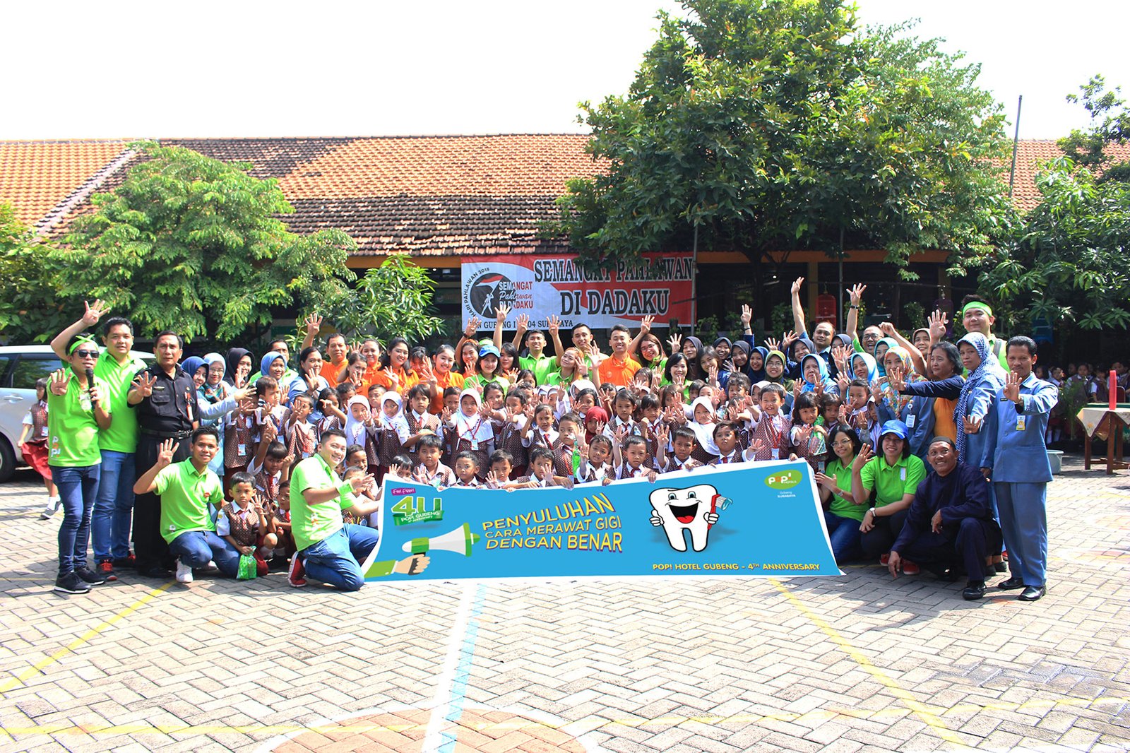 Di hari jadinya yang ke – 4 POP! Hotel Gubeng Surabaya menyumbang pohon dan tanaman hias untuk SDN Gubeng 1 Surabaya. Hal ini merupakan bentuk kepedulian pada lingkungan lestari. Selain menyumbang pohon, POP! Hotel mengajak siswa-siswi kelas 1 SDN Gubeng 1 rajin menggosok gigi secara benar dan teratur.