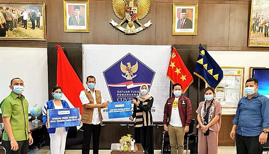 Ketua Umum Forum CSR DKI Jakarta, Mahir Bayasut (kiri) bersama para kolaborator menyerahkan bantuan kepada Badan Nasional Penanggulangan Bencana (BNPB) untuk mendukung upaya penanggulangan pandemi COVID-19 di Indonesia. Foto : Istimewa