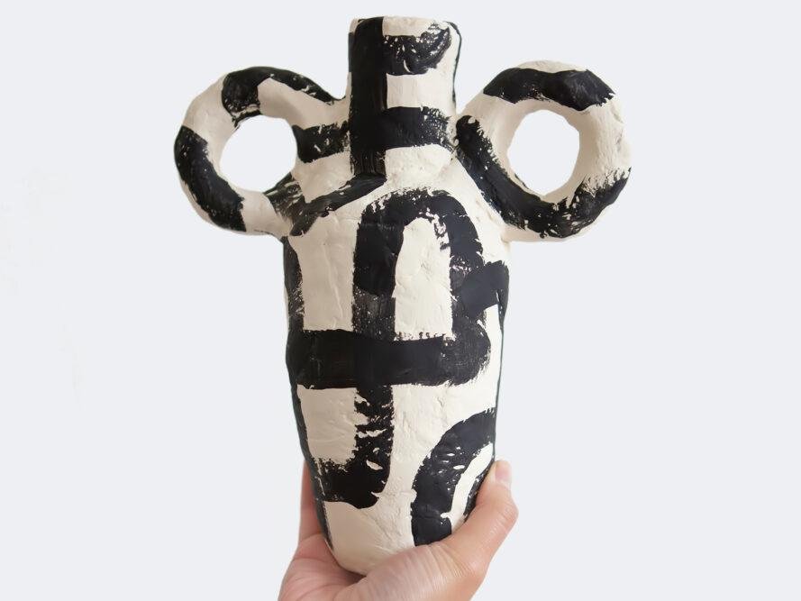 Vas bunga karya Fuente ini dibentuk perlahan bagian per bagian dan meninggalkan jejak jari tangan yang eksotis di permukaaan. Beberapa dibiarkan dengan warna apa adanya, sebagian lagi diwarnai dengan cat air yang ramah lingkungan. Alih-alih wadah bunga hidup, Fuente menyarankan untuk menjadikannya vas bunga kering karena tak bisa menampung air. Alhasil, vas atau potnya ini sebenarnya juga bisa menghemat air.
