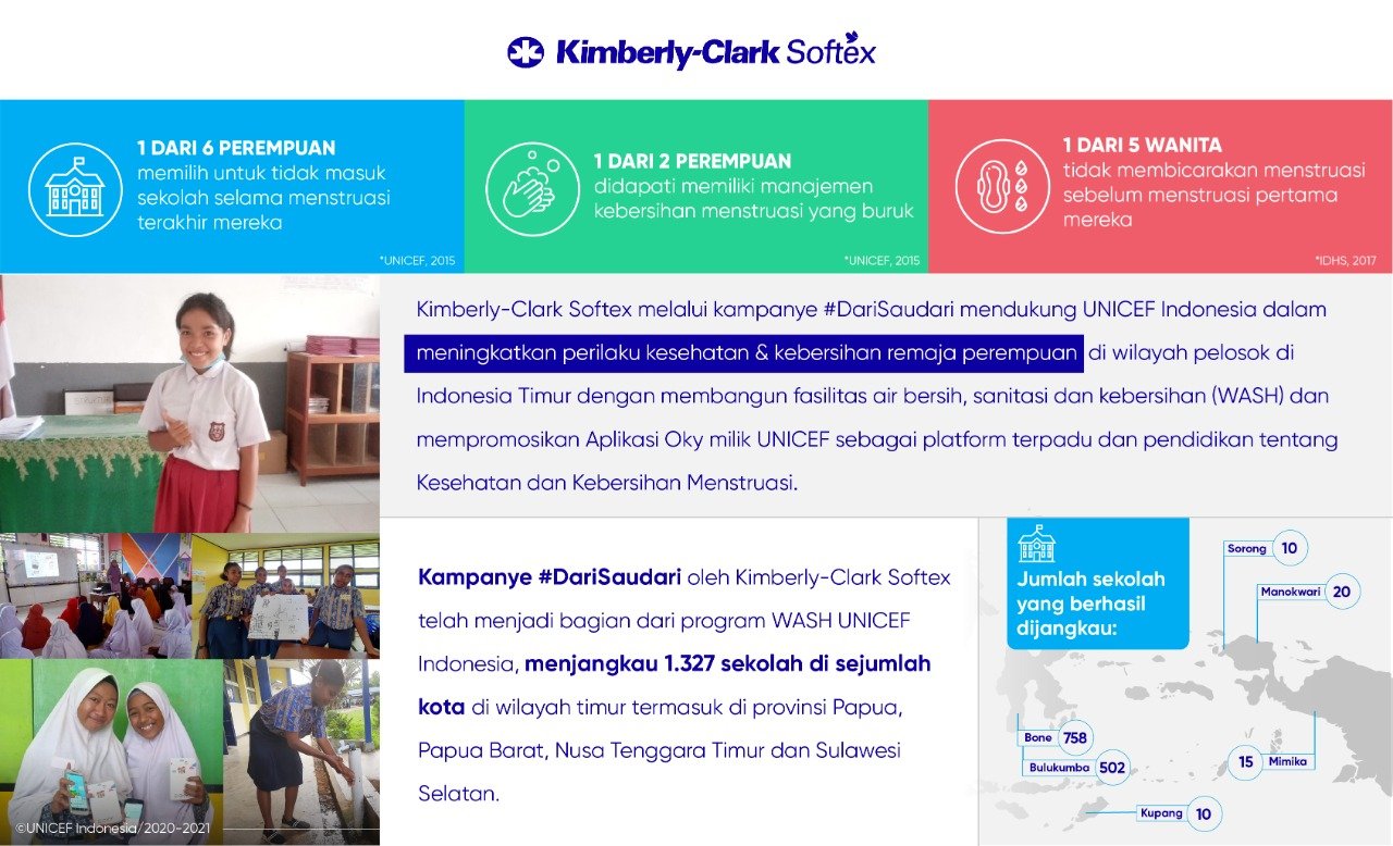 Melalui kampanye sosial #DariSaudari, Kimberly-Clark Softex mendukung UNICEF Indonesia dengan bantuan finansial sebesar Rp 1,5 miliar per tahun untuk program WASH dan sosialisasi aplikasi Oky, yaitu aplikasi edukasi terintegrasi milik UNICEF. Oky adalah sumber informasi kesehatan dan kebersihan menstruasi yang terpercaya.